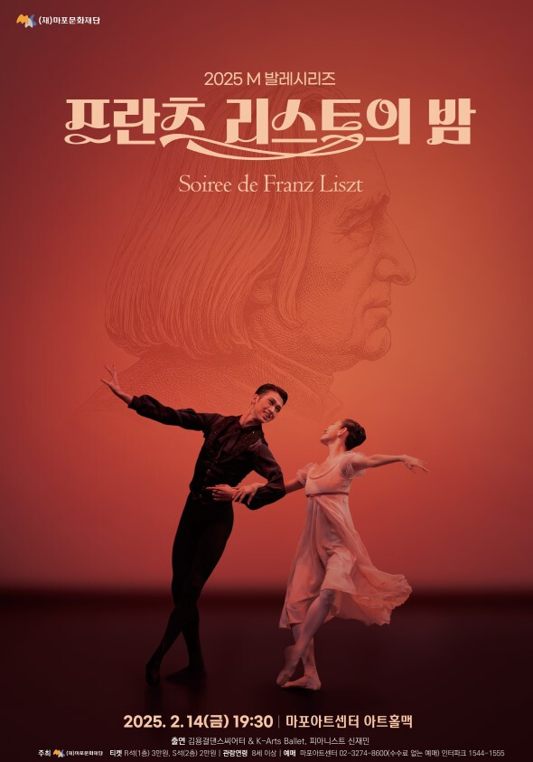 [시민일보 = 문민호 기자] 마포문화재단(송제용 대표이사)은 오는 2월 14일 2025 ‘M 발레시리즈’ 첫 번째 공연으로 클래식 작곡가와 K 창작 발레를 접목시킨 <프란츠 리스트의 밤>을 개최한다. 이번 공연에서는 낭만주의를 대표하는 작곡가 프란츠 리스트의 음악에 발레 안무와 해설을 더해 관객에게 창작 발레의 매력을 더욱 친근하게 선보이고자 한다.