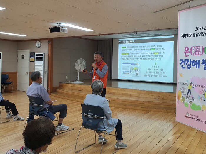| ▲ 기억친구리더 봉사단원이 노인복지시설에서 치매인식개선교육을 진행하고 있다. (사진=강동구청 제공) |