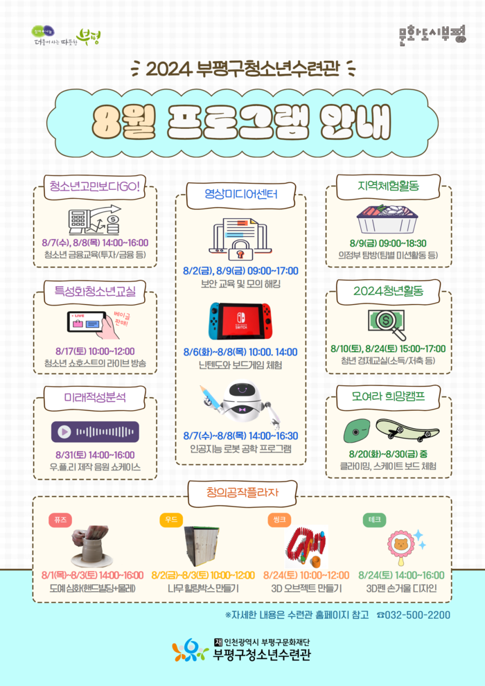 [인천=문찬식 기자] 인천 부평구 청소년수련관에서 오는 8월 상반기 청소년동아리콘서트를 비롯한 다양한 체험과 문화예술 프로그램을 진행한다.