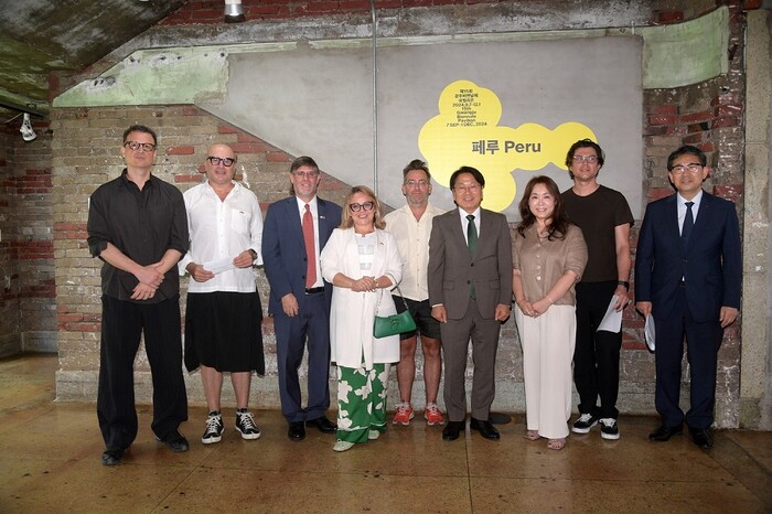 | ▲ 강기정 광주광역시장(오른 쪽부터 네 번째)이 5일 동구 ‘김냇과’에서 열린 제15회 광주비엔날레 페루 파빌리온 개관식에 참석해 관계자들과 기념사진 촬영을 하고 있다. /광주광역시 제공 |