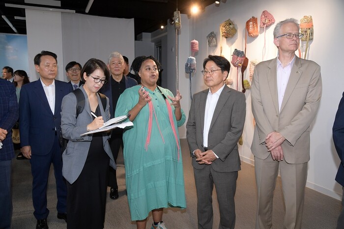 | ▲ 강기정 광주광역시장(오른 쪽부터 두 번째)이 5일 동구 '충장22'에서 열린 제15회 광주비엔날레 스웨덴 파빌리온 개관식에 참석해 관계자로부터 작품 설명을 듣고 있다. /광주광역시 제공 |