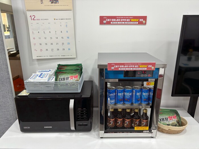 쉼터에는 이동노동자가 추위에 언 몸을 녹일 수 있도록 난방기가 상시 가동되며, 핫팩 등 방한물품이 준비돼 있다.