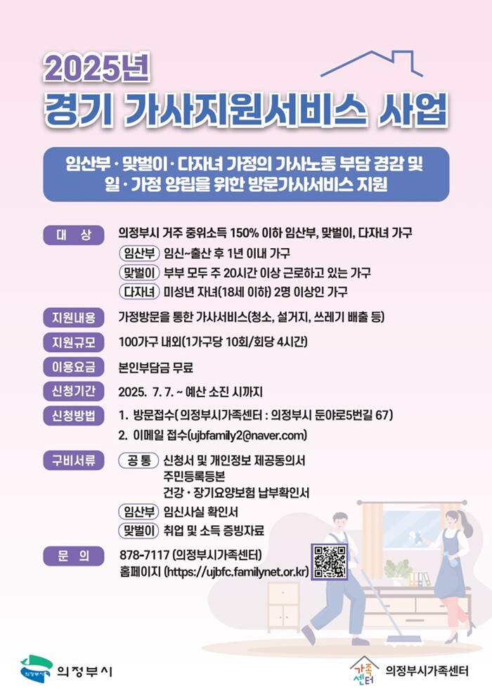 이 사업은 의정부시 거주 중위소득 150% 이하 임산부ㆍ맞벌이ㆍ다자녀 가구의 가사 부담을 줄이기 위한 ‘일ㆍ가정 양립지원 사업’의 일환이다.
