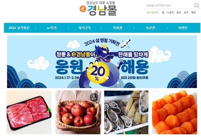 [창원=김점영 기자] 경남도는 민족 고유의 명절 설을 맞아 도민의 장바구니 물가 부담을 줄이고, 소상공인 온라인 판로를 지원하기 위해 오는 2월8일까지 e경남몰에서 설맞이 할인 기획전을 실시한다고 18일 밝혔다.