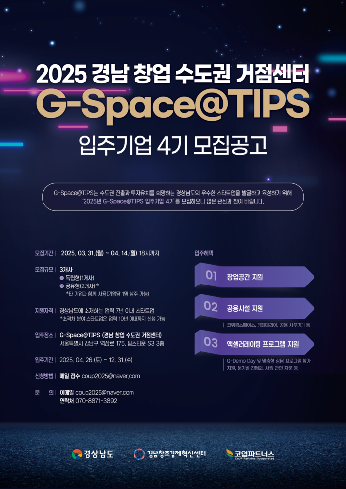 한편 도는 지난 2024년 ‘경남 창업 수도권 거점(G-Space@Tips)’ 운영을 통해 도내 기업(49개사)에 1:1 심층 투자상담(94회), 투자설명회(IR) 프로그램(7회) 등의 투자유치 기회를 제공했다.