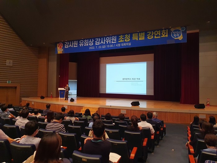 [광주=정찬남 기자] 광주광역시는 22일 시청 대회의실에서 감사원 유희상 감사위원을 초청해 ‘감사를 통한 지방공공기관의 경쟁력 강화 방안’이라는 주제로 특별강연을 개최했다.