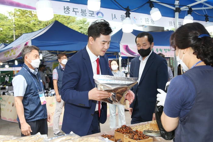 오언석 도봉구청장은 최근 창동역 1번 출구 고가하부 광장에서 열린 ‘2022년 도봉구소상공인회 추석맞이 행복응원 장터’를 방문해 지역 소상공인들을 격려하고, 직접 물건을 구매했다. 사진은 장터를 방문한 오 구청장(가운데)이 특산물을 구매하고 있는 모습. (사진제공=도봉구청)