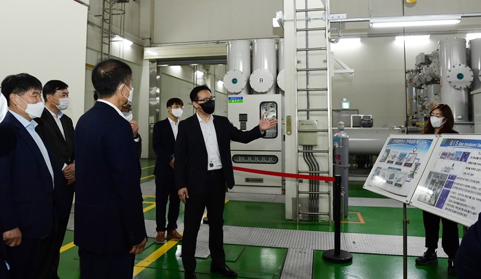 | ▲ 계통계획처 이철휴 처장이 LH 신경철 국토도시개발 본부장 및 도시계획처 관계자에게 주민친화적 345kV 신양재 변전소에 대해 현장안내를 하고 있다 (사진제공=한국전력) |