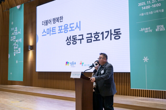 | ▲ '2025년 서울시 주민자치 성과공유회‘에서 우수사례를 발표하는 지준환 금호1가동 주민자치회장의 모습. (사진=성동구청 제공) |