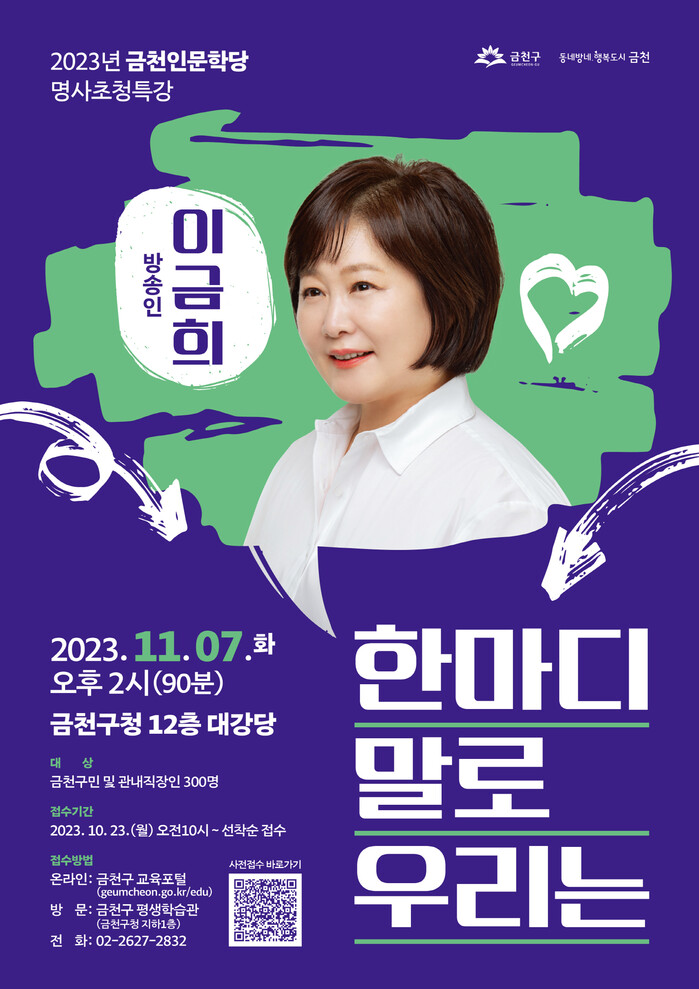 [시민일보 = 여영준 기자] 서울 금천구(구청장 유성훈)는 오는 11월7일 오후 2시 구청 대강당에서 이금희 강사를 초청해 ‘금천인문학당’ 특강을 진행한다고 밝혔다.