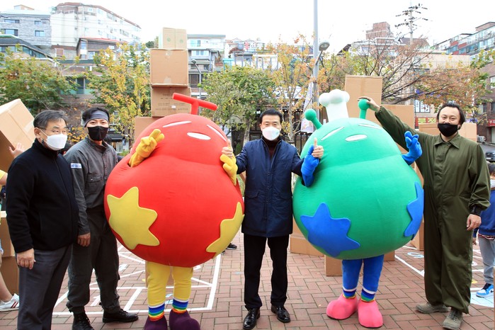 성북구와 성북문화재단이 최근 개최한 제13회 '2021 성북세계음식축제 누리마실'이 성공적으로 마무리됐다. 올해도 지역예술인, 지역가게, 문화·예술 공간과 함께하는 다양한 공연과 요리를 주제로 한 40여개의 프로그램이 진행됐다. 사진은 이승로 구청장(가운데)이 누리마실 축제 마스코트 누리·마실과 함께 기념사진을 찍고 있는 모습. (사진제공=성북구청)