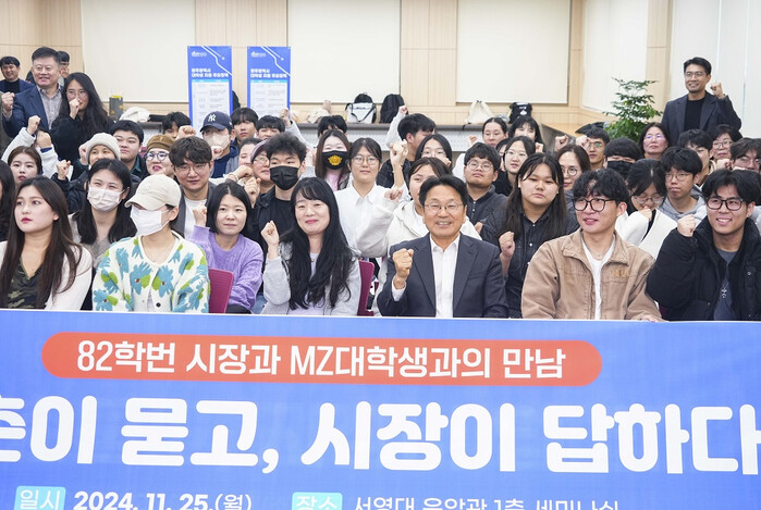 [광주=정찬남 기자] 강기정 광주광역시장, 25일 오후 북구 서영대학교를 찾아 ‘청춘이 묻고, 시장이 답한다’를 주제로 대학생들과 대화 후 기념촬영./광주광역시 제공