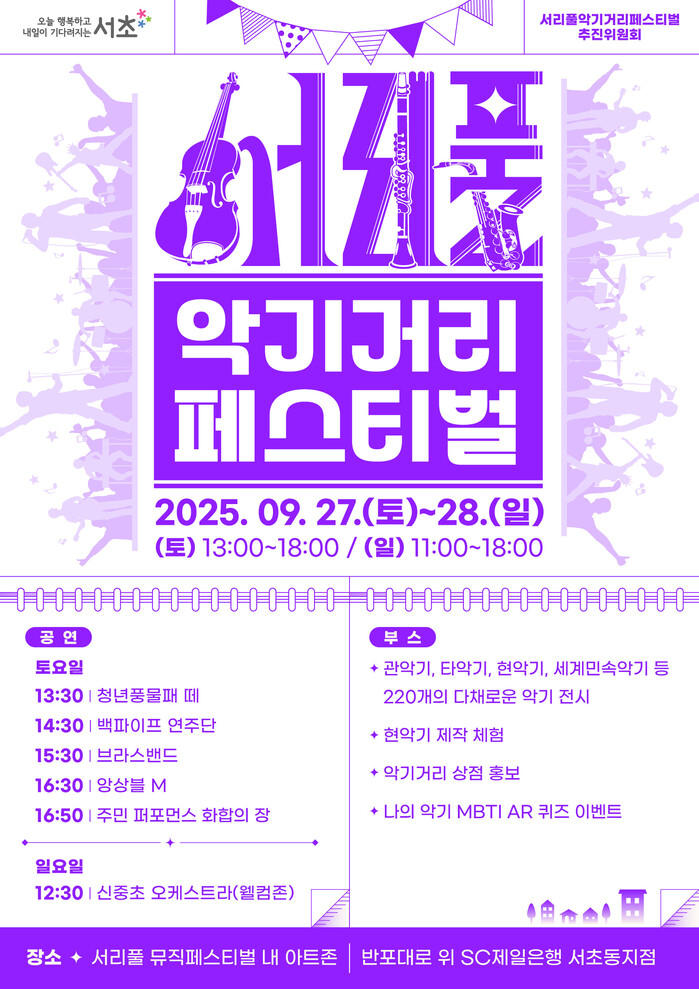 [시민일보 = 박소진 기자] 서울 서초구(구청장 전성수)는 '2025 서리풀뮤직페스티벌' 기간인 오는 27일부터 28일까지 반포대로 일대에서 ‘제7회 서리풀 악기거리 축제’를 개최한다고 밝혔다.