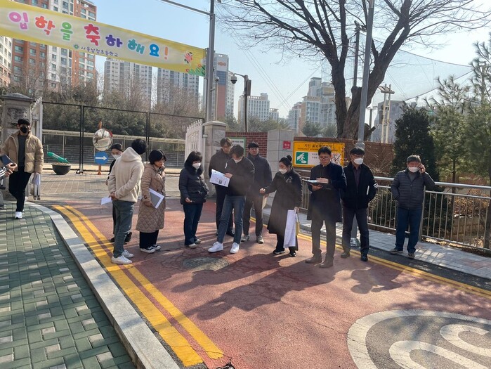 | ▲ 2023년 2월 진행한 남정초등학교 통학로 현장 점검 모습. (사진=용산구청 제공) |