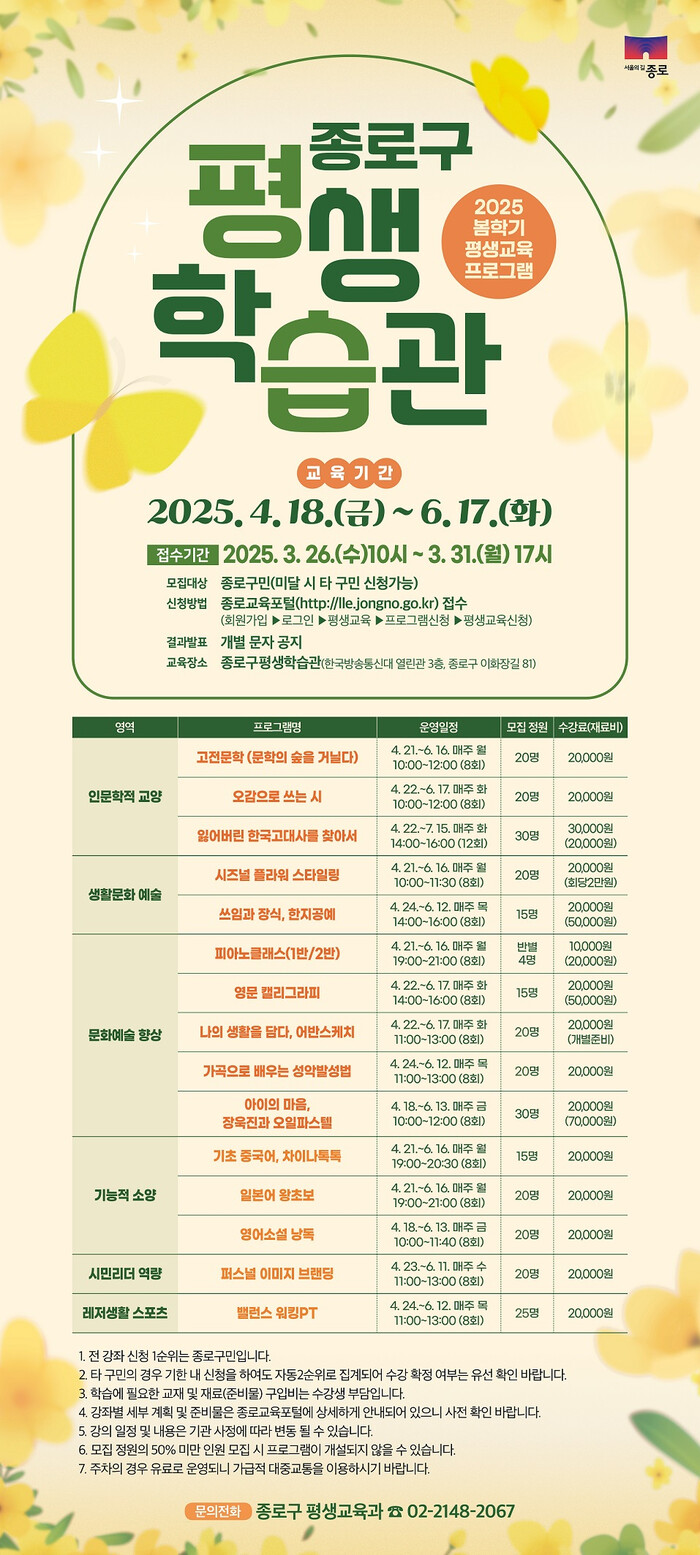 [시민일보 = 이대우 기자] 종로구(구청장 정문헌)가 이달 26일부터 31일까지 「2025년 봄학기 평생교육 프로그램」 수강생을 모집한다.