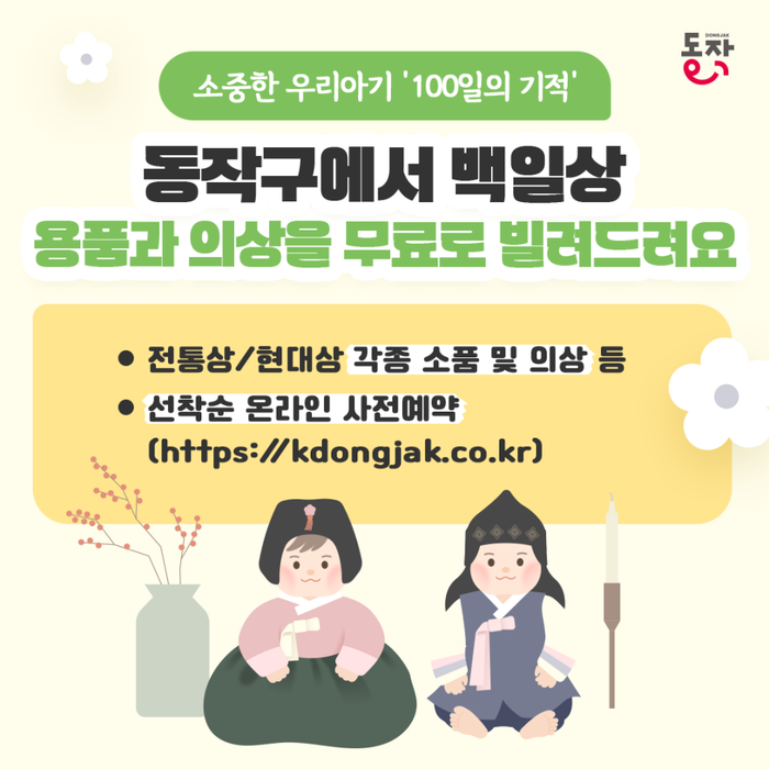 [시민일보 = 여영준 기자] 서울 동작구(구청장 박일하)는 생애 단 한번뿐인 아이의 백일을 특별하게 기념할 수 있도록 ‘백일상 무료 대여 사업’을 오는 4월부터 시작한다고 15일 밝혔다.