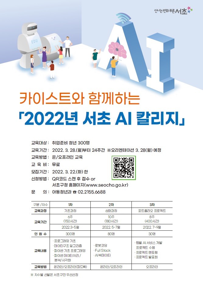 ‘서초AI칼리지’는 4차 산업 혁명시대를 대비한 핵심기술 교육으로 기업이 필요로 하는 특화된 인재를 양성할 뿐만 아니라, 취업까지 원스톱으로 지원하는 서초구 청년교육의 대표사업이다.