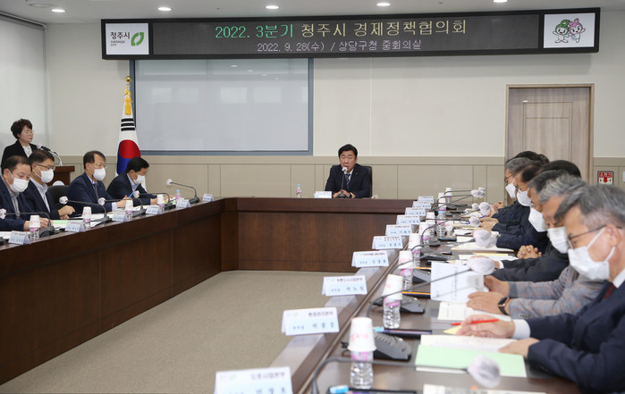 코로나19 이후 2년 6개월 만에 개최한 이번 경제정책협의회에는 이범석 청주시장을 비롯해 양재권 한국산업은행 청주지점장, 김시군 NH농협 청주시지부장 등 청주지역 14개 경제 관련 기관장들이 참석해 주요 현안에 대해 의견교환을 하는 시간을 가졌다.