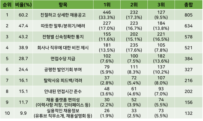 설문조사 결과, 청년 구직자들이 꼽은 최고의 채용 경험으로는 ▲ 친절하고 상세한 채용공고(60.2%), ▲ 따뜻한 말투/분위기/배려(47,4%), ▲ 전형별 신속‧정확한 통지(43.2%) 등이 포함되었다.