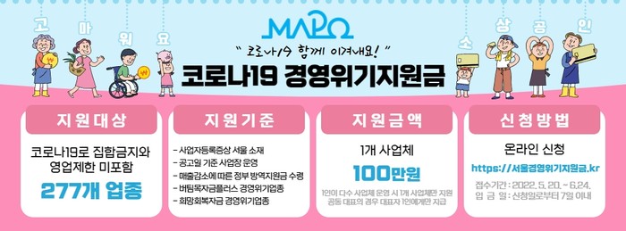 [시민일보 = 박준우 기자] 마포구가 코로나19로 어려움을 겪은 277개 경영위기업종 소상공인에게 '경영위기 지원금' 100만원을 지급한다.