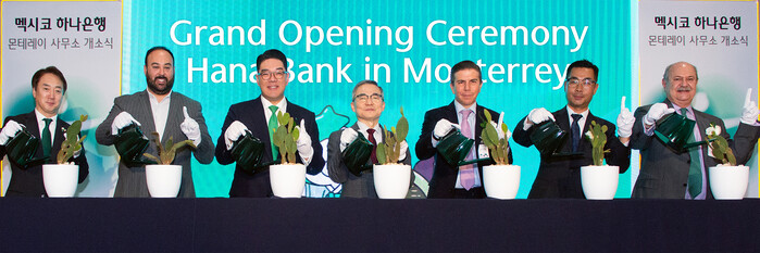 | ▲ 이날 개소식에 참석한 이은형 하나금융그룹 부회장(왼쪽 세번째)이 허태완 주멕시코 대사(왼쪽 네번째), 호세 라몬 카날레스 마르케스 멕시코 금융위원회(CNBV) 부위원장(왼쪽 다섯번째), 엠마누엘 루 누에보 레온(Nuevo Leon) 주정부 차관(왼쪽 두번째) 등 관계자들과 함께 선인장 식수 세레모니를 하며 기념촬영을 하고 있다. (사진=하나금융그룹 제공) |