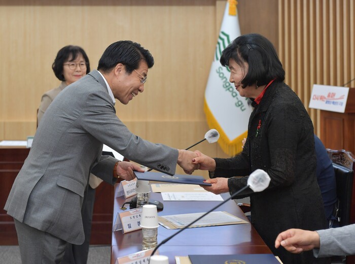 | ▲ 지난 5월30일 성실·모범납세자 표창수여식에서 감사 인사를 전하는 서강석 구청장. (사진=송파구청 제공) |