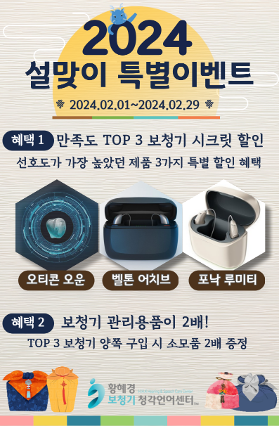 올해로 창립 20주년을 맞은 황혜경보청기 청각언어센터는 지난 한 해 동안 가장 만족도가 높았던 상위 3가지 모델을 대상으로 특별 할인 혜택을 준비했다. 이벤트 적용은 각각 오티콘 오운(OWN), 벨톤 어치브(Achieve), 포낙 루미티 (Lumity) 제품이다. 더불어 이벤트 대상 제품을 양이 모두 구입하면, 보청기 관리용품을 2배 증정하는 혜택도 함께 준비하여 할인과 더불어 소모품 추가 증정서비스도 받을 수 있다.
