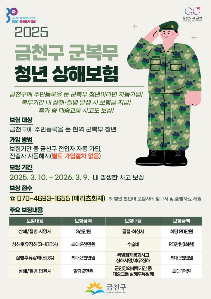 [시민일보 = 여영준 기자] 금천구(구청장 유성훈)는 군복무 중 상해 등 피해를 입은 청년들을 위해 ‘군복무 청년 상해보험’을 지원한다고 밝혔다.