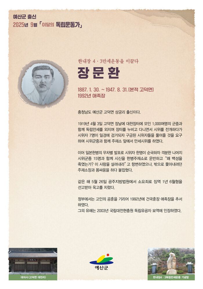 [예산=김의석 기자] 충남 예산군은 고덕면 상궁리 출신 장문환 독립운동가를 ‘2025년 9월 이달의 독립운동가’로 선정했다고 밝혔다.