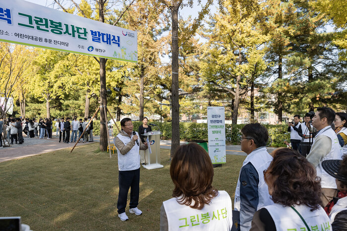 서울 광진구가 지역주민과 합심해 정기적인 환경 정화 활동을 펼치는 ‘그린봉사단’을 운영한다. 사진은 30일 그린봉사단 발대식에 참석한 김경호 구청장이 축사를 하고 있는 모습. (사진=광진구청 제공)