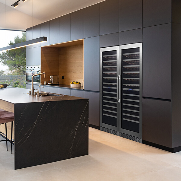 빌트인 설치 시 주방 레이아웃의 최적화된 기능으로, 보보스 와인셀러는 아일랜드 식탁 아래에 완벽하게 들어가 공간 활용을 극대화했다.