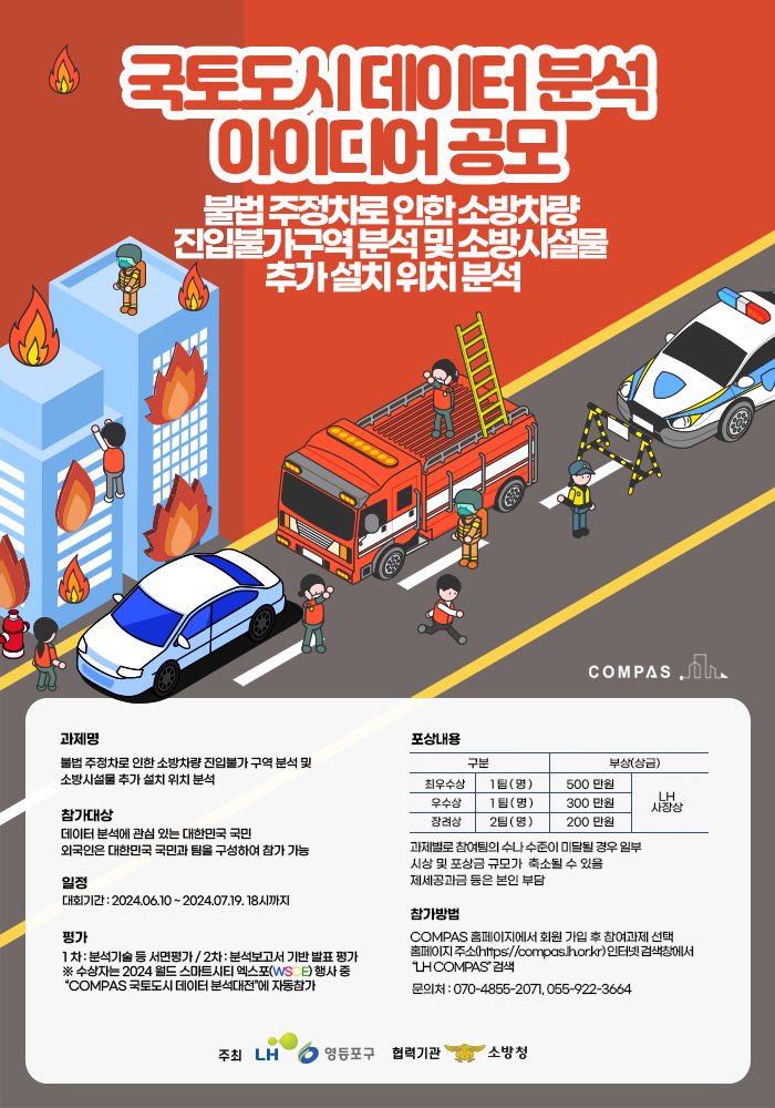 참여 방법은 한국토지주택공사(LH)의 ‘COMPAS’ 누리집을 통해 참여할 수 있으며, 데이터 분석에 관심 있는 개인 또는 5인 이하로 구성된 팀이라면 누구나 참여 가능하다.