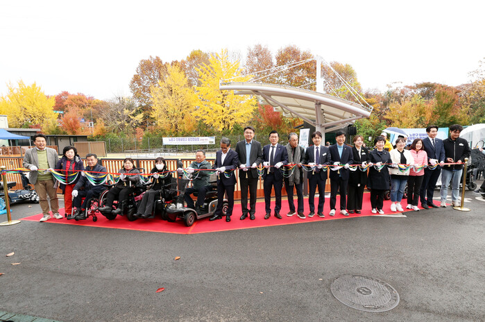 오승록 서울 노원구청장이 최근 중랑천환경센터 주차장에서 열린 전동보장구 운전연습장 개장식에 참석했다. 사진은 개장식에 참석한 오 구청장이 관계자들과 기념 촬영하는 모습. (사진=노원구청 제공)