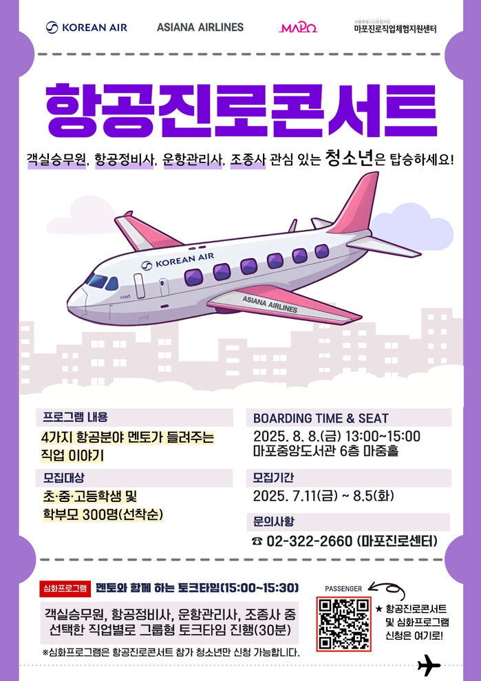 [시민일보 = 문민호 기자] 서울 마포구(구청장 박강수)는 청소년들에게 항공 분야에 대한 생생한 진로 정보를 제공하기 위해 오는 8월8일 오후 1시 마포중앙도서관 6층 마중홀에서 ‘2025 항공진로콘서트’를 개최한다고 23일 밝혔다.