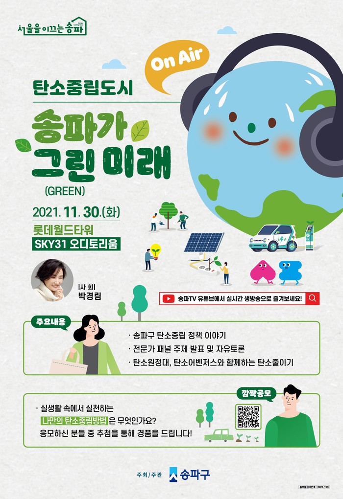 [시민일보 = 이대우 기자] 송파구(구청장 박성수)가 30일 오후 3시 롯데월드타워 SKY31 오디토리움에서 정책토크콘서트 ‘탄소중립도시! 송파가 그린(Green) 미래’를 개최한다.