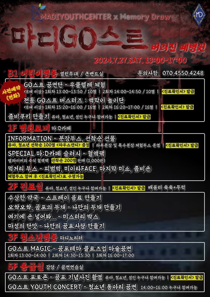 이날 '버려진 폐병원'에 방문하는 청소년들은 공포테마 체험, 놀이 부스, 마술쇼, 청소년 동아리공연, 먹거리 부스, 포토존 등을 관람하거나 즐길 수 있다. 특수분장을 체험하고 공포 아이템을 만들어보는 체험 부스 소재는 물론 먹거리 부스의 간식거리도 혈액팩(슬러시), 좀비손(과자묶음)처럼 전체적인 테마와 어울리게 준비했다.