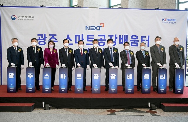 [광주=정찬남 기자] 문영훈 광주광역시 행정부시장(좌측부터 5번)이 8일 오후 중소벤처기업진흥공단 호남연수원에서 열린 스마트공장배움터 개소식에 참석해 현판 제막식을 한 후 기념촬영을 하고 있다.