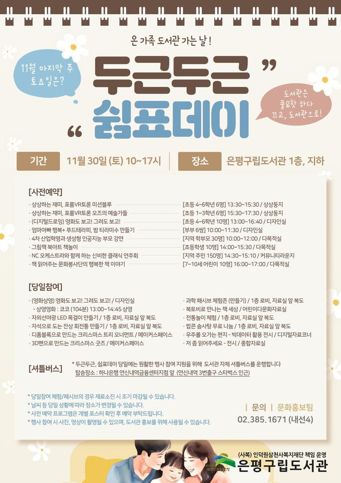 기타 자세한 사항은 은평구립도서관 문화홍보팀(02-385-1671, 내선4)으로 전화 문의하거나, 도서관 누리집을 참고하면 된다.