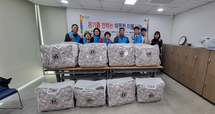 서울 은평구 불광1동이 최근 지역사회보장협의체의 주관으로 사회적 고립 위험이 있는 1인 가구를 대상으로 따뜻한 겨울 이불 40채를 전달했다. 사진은 이불 전달 전 기념촬영을 하고 있는 관계자들의 모습. (사진=은평구청 제공)
