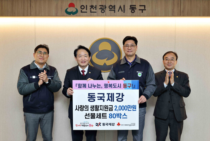 [인천=문찬식 기자] 동국제강이 최근 인천 동구청에서 지역내 노인들을 위한 설맞이 ‘사랑의 생활지원금’ 2000만원 전달식을 개최했다고 12일 밝혔다.