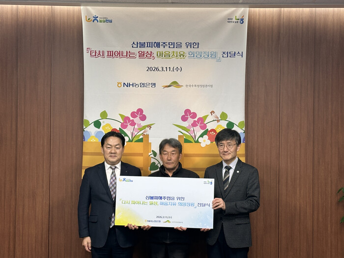 [시민일보 = 문민호 기자] NH농협은행(은행장 강태영)은 11일 경상북도 안동시를 찾아 산불피해 주민의 마음치유를 위한「희망정원 나눔」을 실시했다고 밝혔다. 이날 행사에는 지역 산불피해대책위원회 임원진을 대상으로 사업 설명회를 진행하고 기부금을 전달했다.