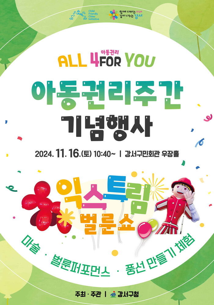 이날 행사는 경찰, 아동보호전문기관, 지역내 아동위원과 함께 아동학대예방 캠페인을 시작으로, 아동권리교육 영상 시청과 강서구립소년소녀합창단의 식전공연 및 관객이 직접 참여하는 ‘해피준의 익스트림 벌룬쇼’를 진행할 예정이다.