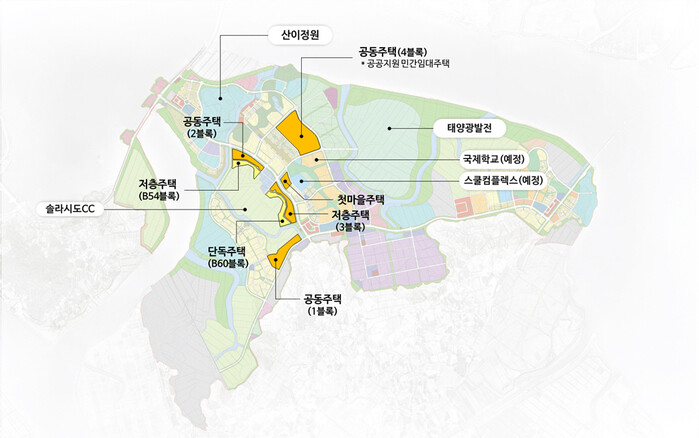우선 솔라시도 기업도시내 주거단지로는 ‘첫마을 주택단지’가 조성된다. 첫마을은 기업도시내 첨단산업 종사자와 해남 지역 주민을 대상으로 공급되는 솔라시도내 최초의 공동주택 단지이다.