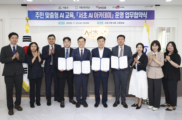 [시민일보 = 박소진 기자] 서울 서초구(구청장 전성수)가 23일 서울교육대학교, 전자신문사, 이티에듀(주)와 함께 ‘서초 AI 아카데미’ 운영을 위한 업무협약(MOU)을 체결했다고 밝혔다.