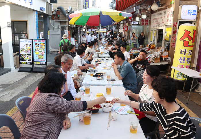 15시에는 시장 내 다이소 옆에 마련한 무대에서 1시간 동안 공연이 열린다. 무대에서부터 100m까지 테이블 50개와 의자 300개를 준비해 방문객들이 편하게 음식을 즐길 수 있도록 만들었다.