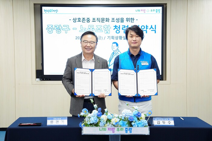 [시민일보 = 여영준 기자] 중랑구(류경기 구청장)는 지난 22일 중랑구노동조합과 함께 ‘청렴, 같이 말해요’ 협약을 체결하고, 직원 대표들과 자유로운 분위기 속 간담회를 진행했다.