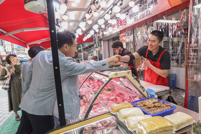 | ▲ 지난해 추석 전통시장 정육점을 방문한 이기재 구청장(왼쪽)이 한 상인과 인사를 나누고 있다. (사진=양천구청 제공) |