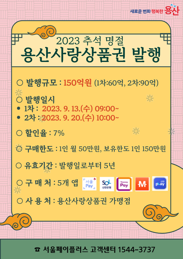 이번 용산사랑상품권은 이달 13일 오전 9시부터 60억원, 20일 오전 10시부터 90억원 규모로 총 2차례 7% 특별할인 판매한다.