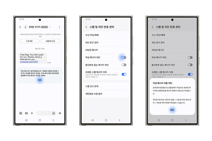 | ▲ 삼성전자와 한국인터넷진흥원(KISA)가 협업해 개발한 '악성 메시지 차단 기능' 이미지 (사진=삼성전자 제공) |