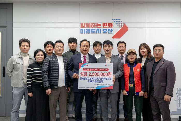 경기 오산시가 25일 한국법무보호복지공단 경기남부지부 가족지원위원회으로부터 지역내 저소득 취약계층 가정 아동들을 위한 성금 250만원을 전달 받았다. 사진은 이권재 시장과 후원 관계자들이 기념 촬영하는 모습. (사진=오산시청 제공)